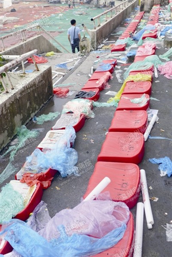 昨天上午9时许,记者来到市体育中心,在体育场内看到,看台座位上留下了五颜六色的垃圾——一次性雨衣、矿泉水瓶、传单等,整个体育馆俨然成了一个大型垃圾场。而在体育场外围的道路上、地上也是随处可见被丢弃的雨衣,红红绿绿很是惹眼。