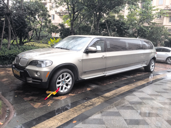 昨日下午,本报“民情365”记者来到椒江新明半岛小区北区,就在映荷轩1幢南面,见到了这辆加长的宝马车。