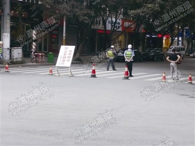 昨天下午,记者来到现场发现,市民所称的牌子依然放置在马路中央,牌子周边还有数个隔离墩,数名协警正在现场维持秩序。一些试图进入的车子被拦下,也有些车子得以成功进入。