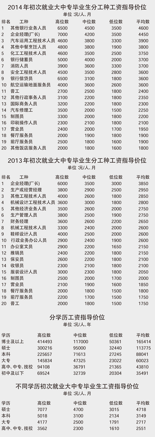 另从“不同学历初次就业大中专毕业生工资指导价位”来看,月薪平均数从高到低按照“硕士”4718元、“本科”3149元、“大专”2717元、“高中、中专、技校”2551元依次排列。