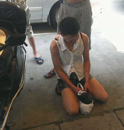 现场参与围堵的蔡先生说,当时他听见有人呼喊,便赶紧上前,只见一名女子打扮的人从游泳馆里跑出来,大家一拥而上将其围住,那个人见逃跑不成,便跪在地上求大家,说自己以后再也不敢了。这时,大家才发现这名“女子”是一个男子,当时现场不少人要揍这名男子,但最后大家还是保持理智,打电话报警。