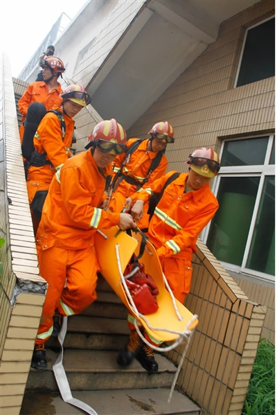 近日,我区组织开展第13个安全生产宣传月系列活动——文化经营单位火灾事故应急预案演练。图为演练过程中,消防员们抬着被困人员撤离“火灾”现场。