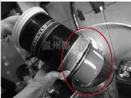 雷先生住在浦发大楼4幢6楼。昨天,在雷先生家中,他将自来水倒进碗中,约1分钟后,就可以看到碗底有细小的沉淀物。接着他拆下连着水龙头的过滤器滤芯给记者看,只见滤芯外面一层黄色,用手一摸,是软的。