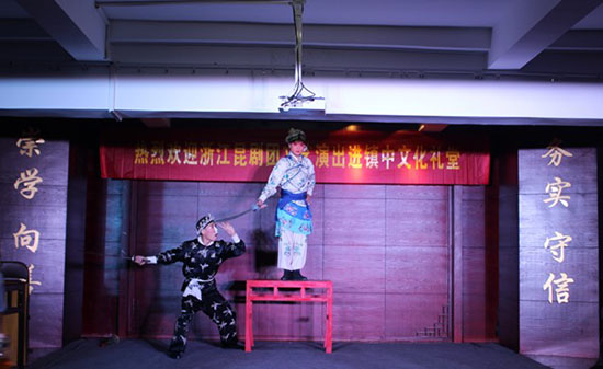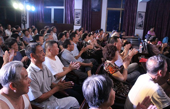 晚上7时,戏歌戏曲联唱《我是中国人》、《京越、黄梅、沪剧》拉开演出帷幕,女生独唱坤歌《兵车行》、戏曲现代戏《沙家浜智斗》轮番上演,戏服华丽精致,舞蹈节奏优美,唱词百转千折顿挫徐急,把昆剧“流丽悠远”的特色演绎得淋漓尽致。之后,武戏精品《三岔口》、昆剧经典丑角戏《风筝误前亲》、《十五贯测字》等经典剧目上演,浙江省昆剧团的艺术家们行腔优美,并以其幽默的表演、深厚的舞台武大功力引来观众不断的笑声和掌声。两个小时,十余个昆剧节目让社区观众意犹未尽,大赞昆剧表演艺术家功法深厚,唱表俱佳。