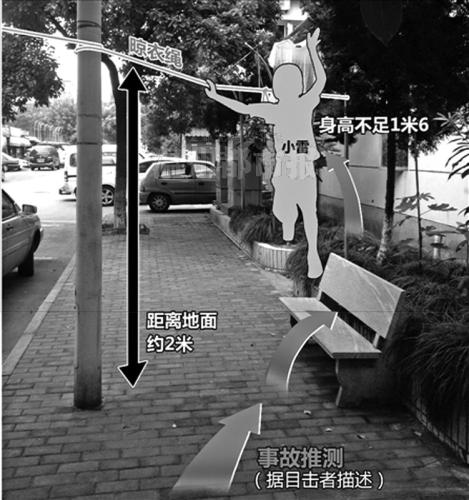 当时赶到现场的《都市快报》记者董吕平说,雷力出事的地点,有一根多股编织起来的粗尼龙绳,尼龙绳一头绑在路边的电线杆上,一头系在铁架子上,当时绳子上没有晾晒衣物。雷力身高不到1米6,但晾衣绳差不多有2米高,直接走过去肯定是碰不到的。不过在绳子附近有张1米多长、有靠背的石凳子,他推测雷力是跳上石凳后,在跳下来的时候没有注意到晾衣绳,就被勒住了。