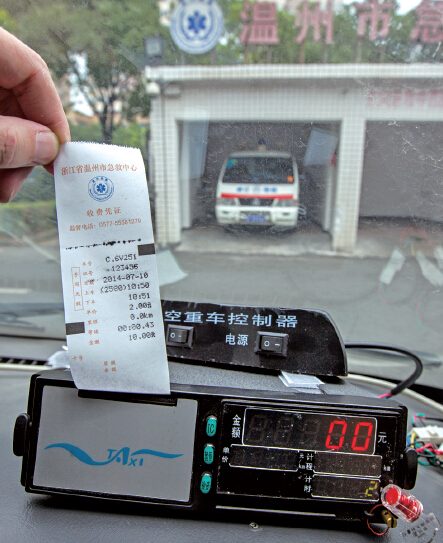 当急救车开至市八医时,时间大概是2点20分,姜显文按下计价器,显示价格“30元”,同时一张以“浙江省温州市急救中心”为抬头的收费凭证打印出来,上面有车号、日期、上下车时间、单价、里程以及金额等详细信息。在将病人送至急救室、换到病床上、与医生完成交接、并向病人收取费用开具发票后,姜显文与陈强静就完成了这一次出车任务。
