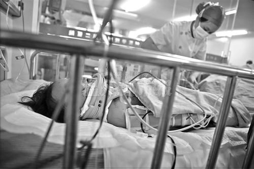 昨天上午,漪漪妈妈李女士瘫坐在温州医科大学附属育英儿童医院儿童ICU病房门口,不停啜泣,围坐在旁的亲戚也一脸沉重。