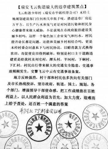 温州网讯最近,有人在一论坛发帖,内容为温州瑞安飞云街道有7个村委会联名举报一家印染企业,该帖称涉事企业未经土地规划部门审批,搭建违章厂房,且生产污水对河道造成污染,散发出来的臭气给当地村民身心健康带来极大威胁,特别是村口主干道路违建更是给少埠村、下埠村及刘宅村、潭头村、半河村、下硐村、下汇村、十八江村等村的村民出行带来不便。