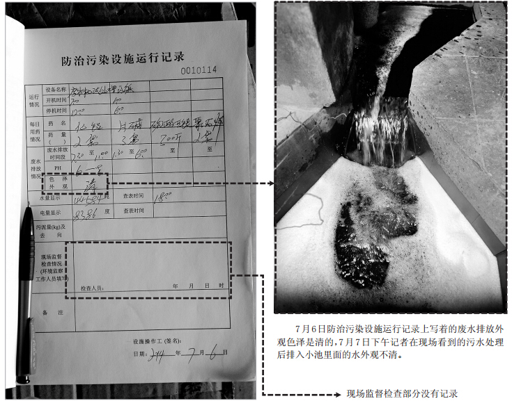 下午2点50分到达厂区,发现污水处理设备正在运转,也许是因为当天天气比较热的原因,废水处理散发出来的臭气挥发开来,在高温作用下愈发熏人。记者在里面呆了5分钟不到,喉咙就被臭气刺激得火辣辣的,摄影记者在废水处理后的排放池边摁了几张照片,眼睛被刺激得眼泪哗啦啦流下来。想起6日该企业防治污染设施运行记录上写着的废水排放色泽外观为“清”,面对眼前废水处理排放到池里的水,真觉得是玷污了一个“清”字。
