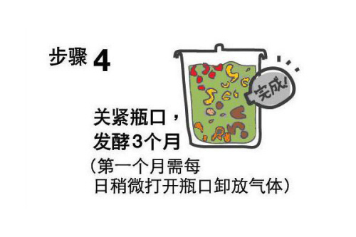 5.制作过程中的第一个月会有气体产生,每天须将瓶盖旋松一次,并立即关紧,释出因发酵而膨胀的气体就好。
