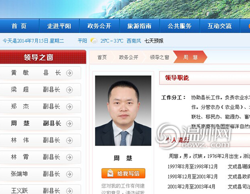 记者注意到,平阳县政府的官方网站“中国平阳”上还挂着周慧的履历。“中国平阳”上的信息显示,“周慧,男,1976年2月出生,浙江文成,无党派,硕士”。他曾任文成县珊溪镇党政办秘书、文成县峃口乡乡长、文成县政府法制办主任、龙湾区人民政府副区长等职。