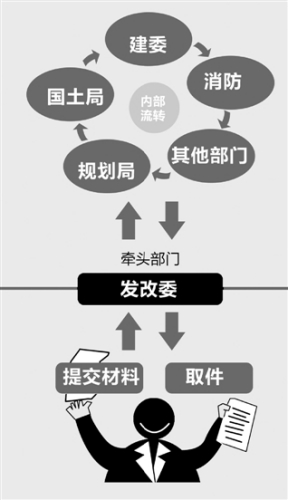 以前,投资一个项目,审批环节相当不容易,从工程的立项、工程规划许可再到施工许可,要经过发改、规划、国土、建委、消防等多个部门,就算是在市民中心办事,也得一个窗口一个窗口来,这个窗口办好了,才能到下一个窗口,跳一步都不行,这个时间拖下来就长了,有的动不动就超过1年时间,有的甚至长达15个月。