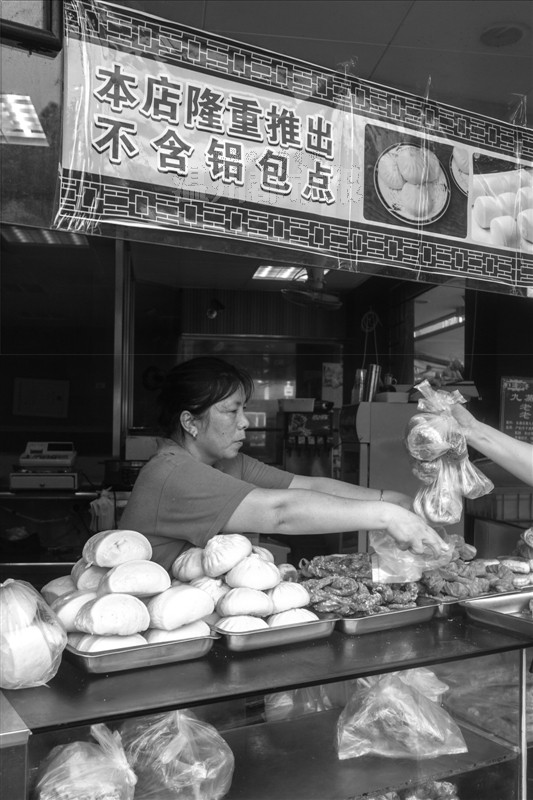店老板回答:“我们是用老面发酵的,你看看我们的馒头,吃起来感觉会很紧。有含铝的那是用了明矾,馒头看起来会很蓬松的。”