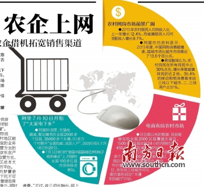 一方面,阿里京东等电商巨头在农村广撒网。另一方面,农产品企业也纷纷搭乘电商顺风车,扩宽销售渠道。