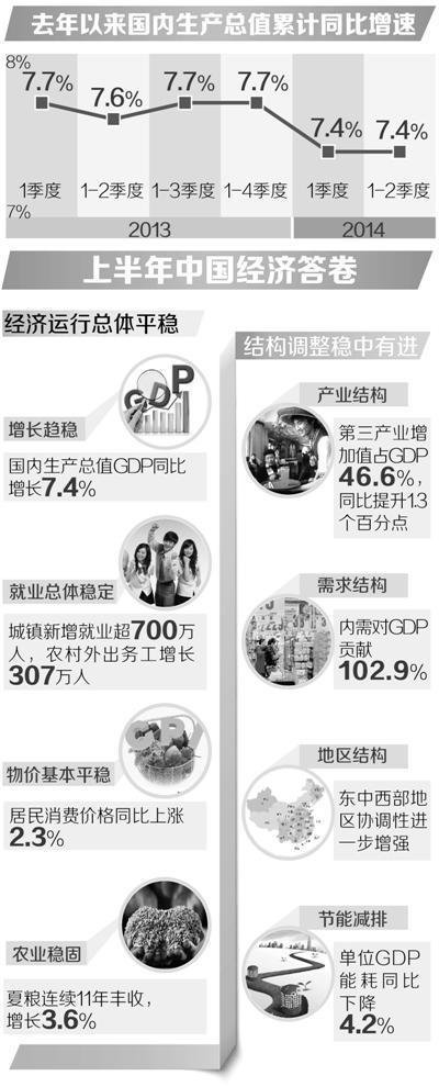 今年上半年,面对错综复杂的国内外形势,中国经济承受着较大的下行压力。党中央、国务院牢牢把握发展主动权,科学统筹稳增长、促改革、调结构、惠民生,坚持向改革创新要动力,向结构调整要助力,着力发挥市场作用,更加注重定向调控,使国民经济总体上在合理增长区间平稳运行。