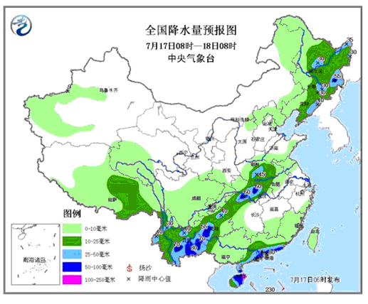 另外,贵州东北部和西南部、湖北中部、云南东部和东北地区东部等地的部分地区有大到暴雨(50~80毫米),中央气象台7月17日06时继续发布暴雨蓝色预警。