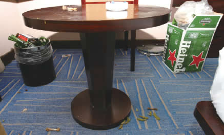 “地毯一旦沾上呕吐物,就要花费很大的时间、精力来清理。”瑶溪王朝大酒店的童经理说,处理房间里的呕吐物一般需要经过初步打扫、抹布擦洗、板刷刷洗、药水去渍、抽洗机清洗及风机吹干等6个步骤,“之后还要经过3天的通风才算完成,这期间房间都是无法接待客人的。”