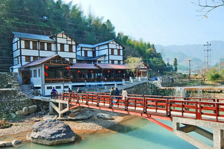 与果园隔龙溪而望,有一座古色古香的明清风格建筑,拥有明清风格占地800平方米的农家乐,提供本地绿色、特色农家菜为主,一天可接待游客700多人,是文成最具特色的农家乐之一。