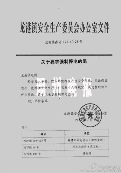 龙港供电所收到的相关函由龙港镇安委办发,龙安委办函[2014]25号文件原文为:经举报人举报,以下单位存在严重安全隐患,无法保证安全。依据《安全生产法》第五十六条规定,决定暂时停产停业整改,请予以采取强制停电措施。文件附件上的地址正是新亮点量贩海鲜城和海鲜超市(见右上图)。