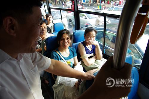 上车后,一层有两、三空位,阮诗科并没有坐下,而是站在一层的过道上跟车上的乘客聊了起来。阮诗科问一位新温州人,平时是不是经常坐公交?对温州公交服务的感受怎么样?这位乘客说自己每天都坐公交,对温州公交的服务他还是非常满意的。