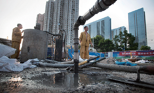 昨天下午,在施工现场,十几个六七厘米粗的管子,像针筒一样被打进地面。陈建国介绍,正是通过这些管孔,将水泥打入地下,它的目的是使得地下的流沙固化。这些管子,相隔距离不等,用以固定地下不同地方的流沙。“总的要打21个口子,目前已经布好了十多个。”