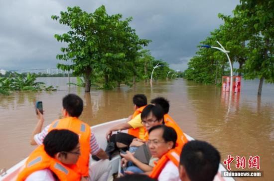 7月21日,受“威马逊”残留云系影响,广西降雨持续,导致部分河流上涨超出警戒水位。流经崇左市宁明县的明江洪水暴涨,将县城、乡镇低洼地带淹没。截至21日晚19时,县城明江最高水位为120.48米,超出警戒水位4.48米,河流将沿岸房屋、道路淹没,当地居民被困家中。当地政府已组织人员转移安置被困居民,运送饮用水以及食品。图为被洪水淹没的花山路。洪坚鹏摄
