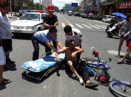 民警陈舜立即下车查看情况,原来伤者骑自行车被肇事者刹车不及撞伤了腿。查看情况后判断,伤者神志清醒,但大腿已明显骨折,伤情较重。