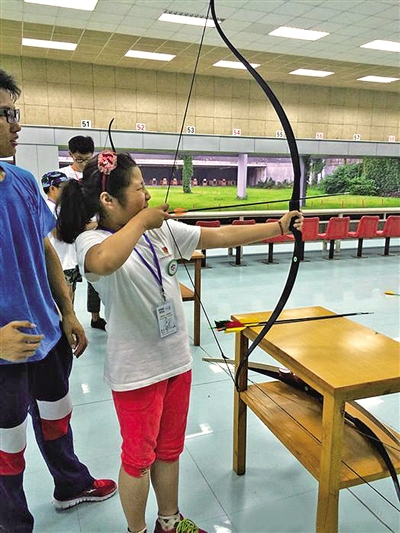 来到方山国家射击训练场,看到壮观美丽的射击场和运动员宿舍,队员们发出一阵阵赞叹声。随后,模拟了一场庄重又热闹的青奥会开幕式,所有的旗手、护旗手、运动员代表精神抖擞,依次步入场馆,在主席台前接受检阅,并受到东道主中国队的热烈欢迎,国歌嘹亮,全场振奋!现场,专业教练亲自对小记者们进行指导:搭箭、预拉、瞄准、射箭……“左肩对着目标靶位,左手持弓,两脚开立,身体的重量均匀地落在双脚上,身体一定要向前微倾呀,拉弦时不要使出全身力气,两手用力扩张,记好啦,肩膀的肌肉必须放松……”小记者练得可认真啦。