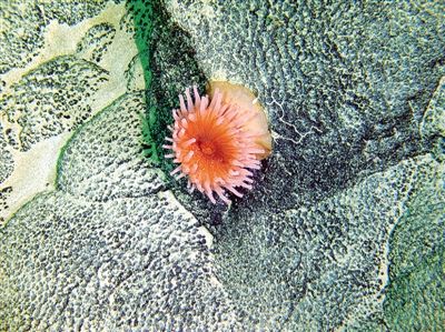 “蛟龙”号载人潜水器21日在西北太平洋采薇海山区开展2014年试验性应用航次第4次下潜作业,最大下潜深度2414米,水中作业时间9小时43分。取得结壳和岩石7块、沉积物样2管、近底层水样8升、生物样品7个,其中海绵2个、珊瑚3个、海参1个、海胆1个。图为“蛟龙”号在海底拍摄的附着在富钴结壳上的海葵。