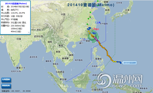 23日7时,“麦德姆”中心位于温州偏南方向约427公里的台湾海峡海面上,就是北纬24.2度、东经120.0度,中心最大风力13级(38米/秒),中心最低气压965百帕,7级风圈半径280-360公里,10级风圈半径120公里,12级风圈半径50公里。