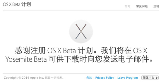 目前中国官网也已经挂出了Yosemite的公测申请页面,我进行了申请,其实申请过程非常简单,登陆Apple账号之后,点一下申请即可,具体何时能够下载,等待邮件通知。