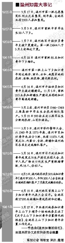 谢榕芳(1970年5月16日赴黑龙江,现任温州市鞋革协会秘书长):1970年5月16日,温州市第二批知青启程奔赴黑龙江生产建设兵团,是我永生难忘的日子。温州有句俗语:“孩儿出远门,必须走大路”,原本从家里到人民广场很近的路,姨妈特意带我绕道走大路,也正因为如此,让我们避过了一场灾难。