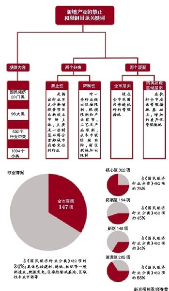 其中既包括全市都要禁止或限制的行业,如建材、造纸、纺织等一般制造业,燃煤发电,区域性物流基地、区域性专业市场等,也包括在四类功能区各自要限制的功能和产业,如核心区(东城区、西城区),在执行全市性管理措施的基础上,要严格禁止制造业、建筑业、批发业,禁止新建和扩建高等学校、大型医院,严格限制酒店、写字楼、展览馆等大型公建。