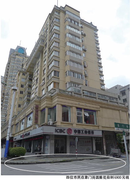 下“钱雨”现场位于市区象门街的顺锦商厦与迎潮大厦之间的路上,边上还有家工商银行。银行的保安张先生说,当时12点多,他在银行里面值班,听说楼上掉钱了,出来一看发现好几个人在捡钱,手中拿着一叠“单佰头”……