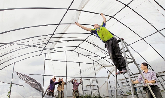 7月24日,温州龙湾区五溪村增元果蔬农民专业合作社基地内,农民忙着更换被台风撕烂的大棚塑料薄膜。台风“麦德姆”过后,当地群众采取各种方式开展生产自救,努力将损失降到最低。