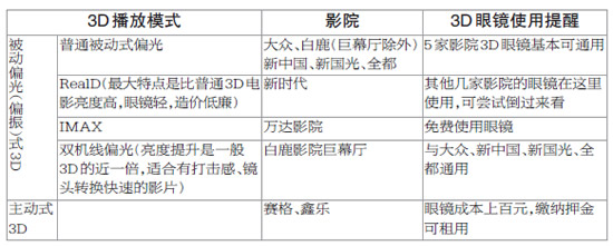 据影院专业人士介绍,一般来说,3D影院采用的3D播放模式有三类,即被动偏光(偏振)式3D、主动快门式3D、Dolby(杜比)3D。由于播放模式不同,使用的3D眼镜也不一样。