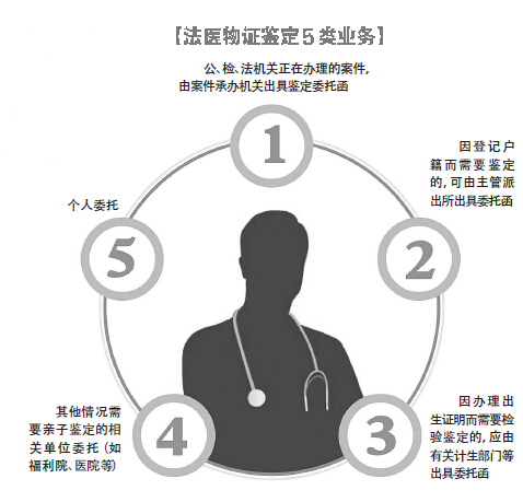 工作人员告诉记者,法医物证鉴定业务(如亲子鉴定、个体识别等)根据委托方不同,分五类(见表)。其中个人委托已经占到五成以上。