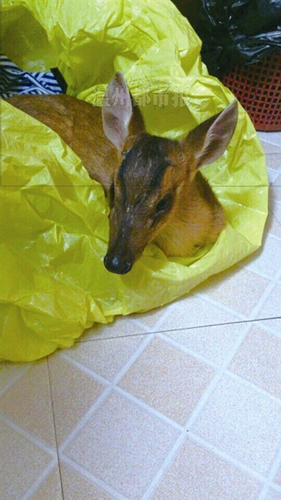 陈建丹是高二学生,老家在永嘉县碧莲镇。7月27日,陈建丹和父亲到碧莲附近的山上游玩,爬到半山腰时发现不远处有一只黄色的“小鹿”半卧在草丛,仔细观察发现它的左后腿受伤了。“它几次挣扎着想站起来都没成功,眼角还流出眼泪来。”陈建丹说,随后她和父亲将“小鹿”抱下山带回家照料。