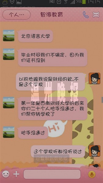 “可之后,他还是一直往后拖,到了5月份他告诉我,我们这批学员已被转给另一家教育机构,负责人是金老师。”叶女士表示,她没见过金老师,一直和他通过QQ联系,金老师也总是一个星期一个星期地往后拖。令叶女士更加奇怪的是,她当初报名的学校,在没得到她同意的情况下,先变更成“西安财经大学”,最后又变成“北京语言大学”。对此,金老师的解释是,因为之前的“枪手”未通过考试,他只能换学校再考。7月16日,金老师却“失踪”了。叶女士慌了,她要求施先生归还学杂费,并设法在网上联系更多受害者,很快,她联系到两个受害者,都是她公司的同事。