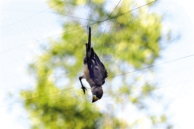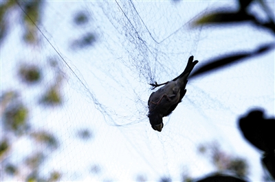昨天清晨,笔者起了个大早,和梅先生在公园内“守株待兔”。早上6时30分,九山文化艺术公园的小山包上,捕鸟大网已被架起,一只无辜鸟儿已被缠住,挣扎着难以脱身,不时发出哀鸣。