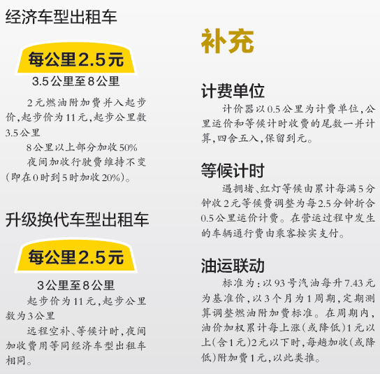 与此同时,此次运价调整方案,鼓励出租车车辆设施、人员素质、技术装备和服务质量进一步提高改善,充分发挥价格杠杆作用,对不同档次的车型进行分类定价,鼓励出租车企业和车主加快对出租车的更新换代。