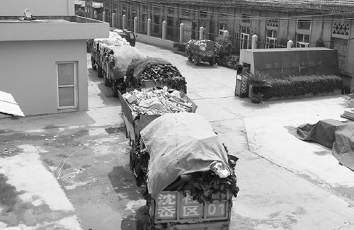 昨天上午,瓯海区仙岩垃圾中转站前,10来辆垃圾车排起长队。记者王诚/摄