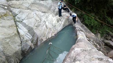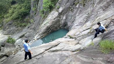 “村里有一处三折瀑,这个小水潭的位置在在三折瀑的中段。”据出警民警说,他们接到报案后,在村民的指引下,经过一条偏僻的小路,看到前方有一个碧绿的小水潭,但四周都是山崖,非常陡峭,无法靠近。他们绕行至高处,从上往下爬,小小翼翼地靠近小水潭。