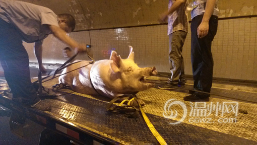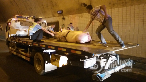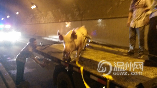 8月4日上午9时许,有人报警称诸永高速往温州方向龙岩头隧道内,有一头母猪在隧道内乱窜,而运送母猪的驾驶员竟冒着生命危险在隧道内抓猪,吓得过往车辆纷纷紧急避让。随后,路面民警及施救人员赶到现场,为避免高速行驶的车辆发生意外,交警第一时间在温州方向龙岩头隧道入口处设立卡口。同时,一个由两位民警、四位巡逻队员组成的捕猪队伍开始在隧道内围捕“越狱”母猪,经过将近10多分钟的努力,终于将母猪的四肢捆绑并拉上施救平板拖车,并带下高速。