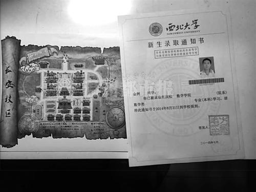 当金洲把信封打开时,首先是一张“羊皮卷寻宝图”映入眼帘,他仔细一看,原来是西北大学的手绘地图,该地图整体呈现暗黄色,以夹页的形式放在录取通知书内。寻宝图正反面分别绘制了西北大学太白和长安两校区的地图,周边用祥云及西北大学校徽等元素进行装饰,透着历史的厚重感。