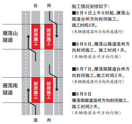 路况:8月4日至8月10日,G15沈海高速温州段雁荡山隧道和雁荡南隧道,进行隧道供电电缆及灯具的维修更换,两条隧道会半幅封道。此次施工除了进行隧道内供电电缆及灯具的维修和更换外,还会对隧道内壁进行清洗。施工期间,隧道内通行方向的灯还是会照常开启,保障安全。