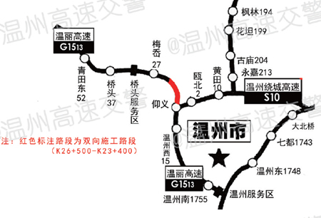 8月7日计划对上述路段金华方向封闭施工,车辆从温州方向车道借道通行,施工期间温州绕城高速需进入金丽温高速车辆,先行驶至仰义收费站掉头,根据自己出行路线决定往金丽温温州方向或丽水方向。