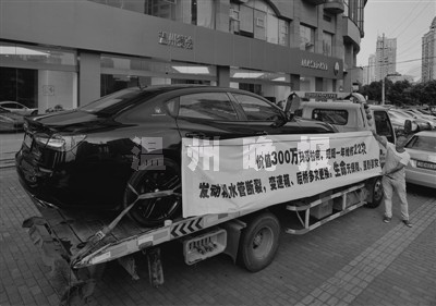 昨天下午,温州市区新城物华天宝边上的玛莎拉蒂店门口,来了一辆挂着浙G(金华)牌照的大货车,货车上停着一辆黑色的玛莎拉蒂跑车,用绳子固定,一侧挂着一条约8米长的白色横幅,上面写着:“价值300万玛莎拉蒂,短短一年维修22次。发动机水管断裂,变速箱、后桥多次更换。生命无保障,强烈要求换车。”
