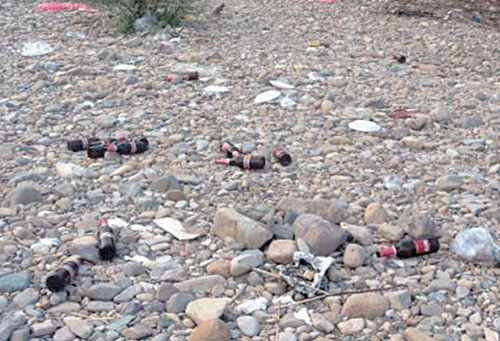 游客烧烤后,给楠溪江留下一堆垃圾和啤酒瓶。