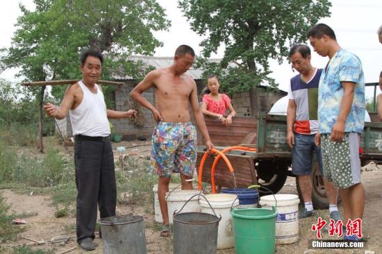 地处伏牛山东麓的河南省鲁山县,遭遇60年一遇的旱灾。5月份、6月份两个月全县降水量仅为58毫米,加之近期持续35度以上高温,出现同期罕见旱灾。当地16.5万名群众饮水困难,且困难人数还在增加。当地政府在无水源但有交通条件的地方组织运水车送水,在无交通条件的地方组织青壮年成立“爱心送水队”挑水送水,全力解决群众饮水困难,特别是优先解决留守老人、留守儿童的饮水问题。图为鲁山县董周乡的送水车为群众送水。胡晓摄
